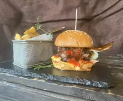 Подається з картоплею фрі або картоплею по-селянськи на вибір та соусом вершковий трюфель. Бургер із курячим стейком гриль, свіжим томатом, салатом з огірка і червоної цибулі та соусом «трюфельний».