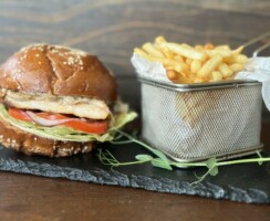 Подається з картоплею фрі або картоплею по-селянськи на вибір та соусом вершковий трюфель. Бургер із курячим стейком гриль, свіжим томатом, салатом з огірка і червоної цибулі та соусом «трюфельний».